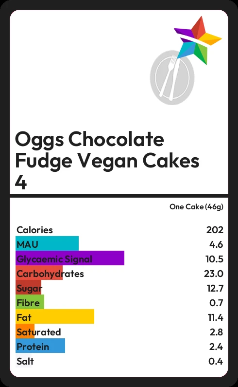Oggs Chocolate Fudge Vegan Cakes 4 contains 12.7g sugar in one Cake (46g) - that is around 3 cubes of sugar.