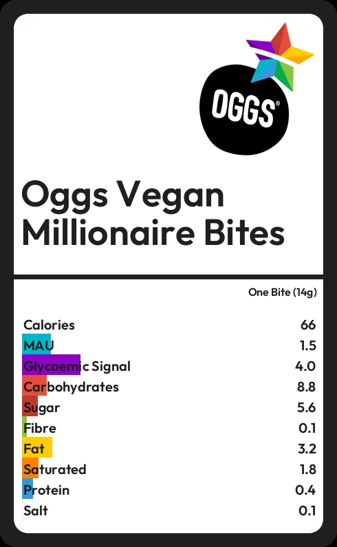 Oggs Vegan Millionaire Bites contains 5.6g sugar in one Bite (14g) - that is around 1 cube of sugar.