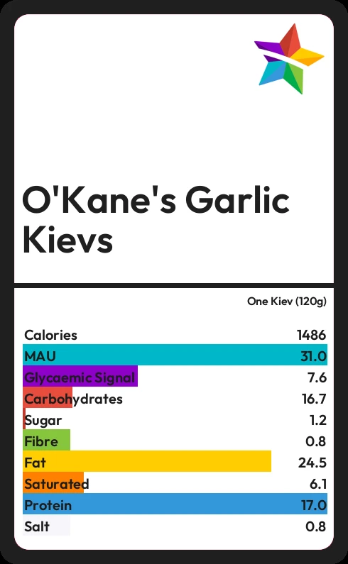 In one Kiev (120g) of O'Kane's Garlic Kievs there are 24.5g of fat of which 6.1g are saturated.