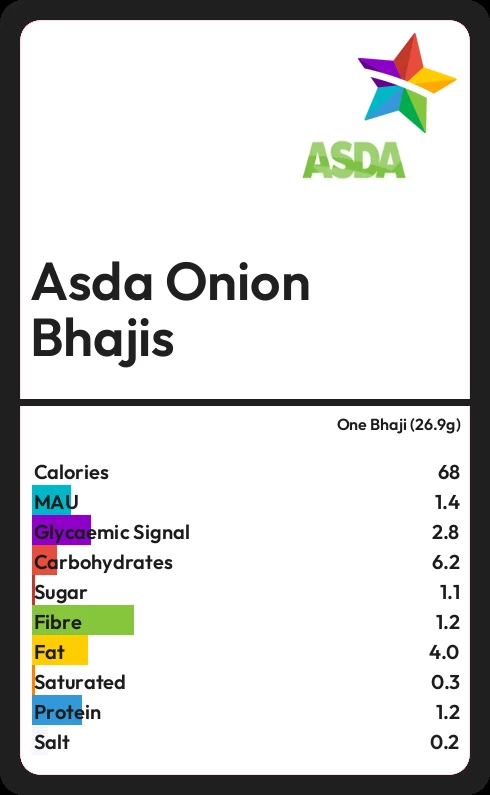 Asda Onion Bhajis contains 1.1g sugar in one Bhaji (26.9g)