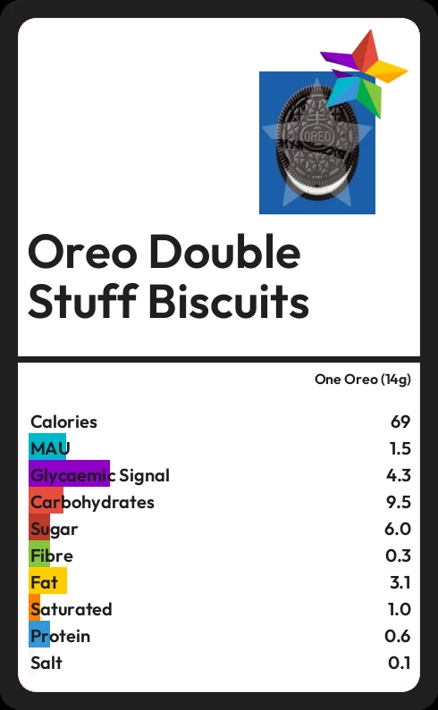 Oreo Double Stuff Biscuits contains 6.0g sugar in one Oreo (14g) - that is around 2 cubes of sugar.