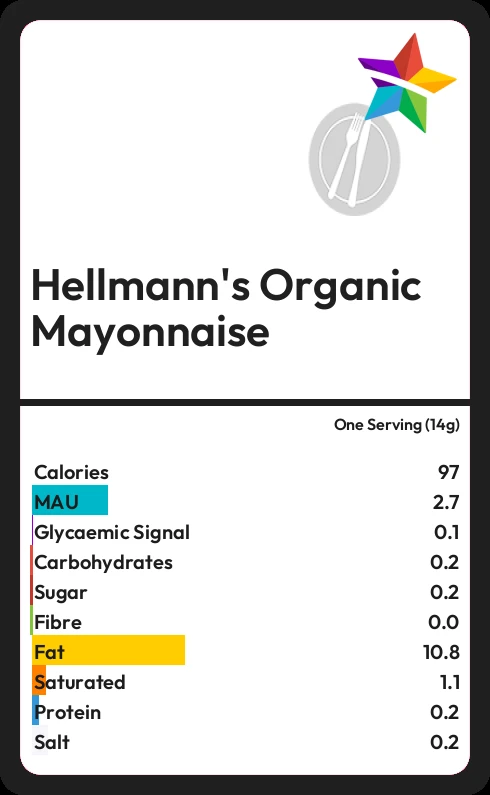 In one Serving (14g) of Hellmann's Organic Mayonnaise there are 10.8g of fat of which 1.1g are saturated.