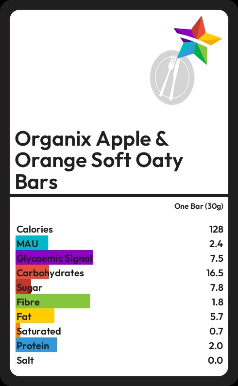 Organix Apple & Orange Soft Oaty Bars contains 127.8 calories in one Bar (30g).