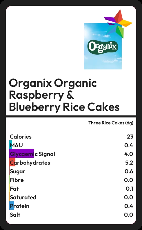 Organix Organic Raspberry & Blueberry Rice Cakes contains 0.6g sugar in three Rice Cakes (6g)