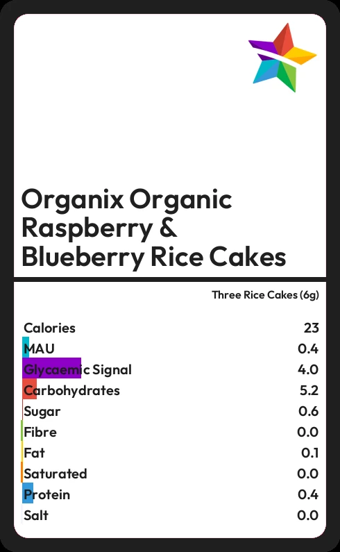Organix Organic Raspberry & Blueberry Rice Cakes contains 23 calories in three Rice Cakes (6g).