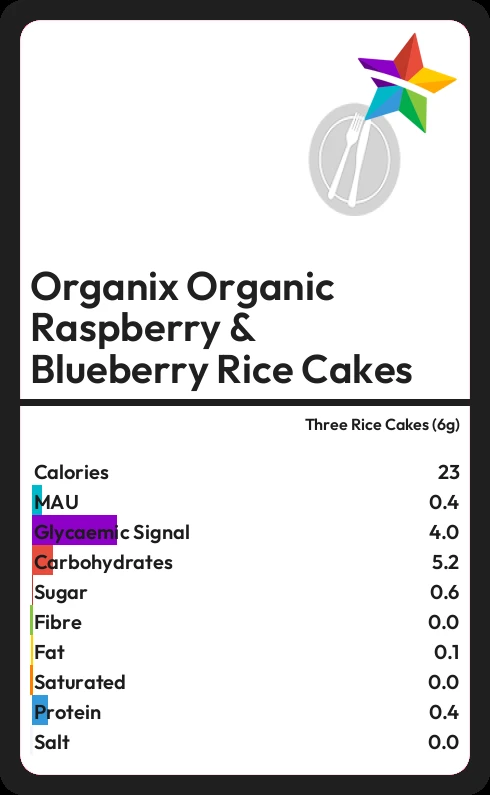 Organix Organic Raspberry & Blueberry Rice Cakes contains 0.6g sugar in three Rice Cakes (6g)