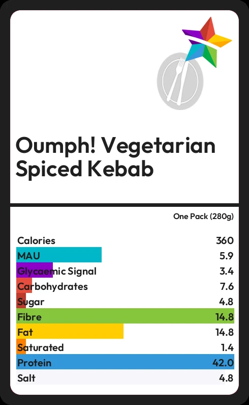 Oumph! Vegetarian Spiced Kebab contains 4.8g sugar in one Pack (280g) - that is around 1 cube of sugar.