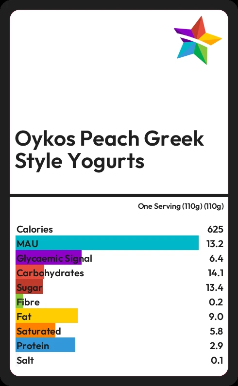 Oykos Peach Greek Style Yogurts contains 13.4g sugar in one Serving (110g) (110g) - that is around 3 cubes of sugar.