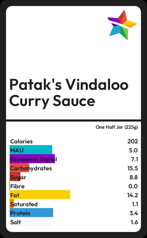 Patak's Vindaloo Curry Sauce contains 202.5 calories in one Half Jar (225g).