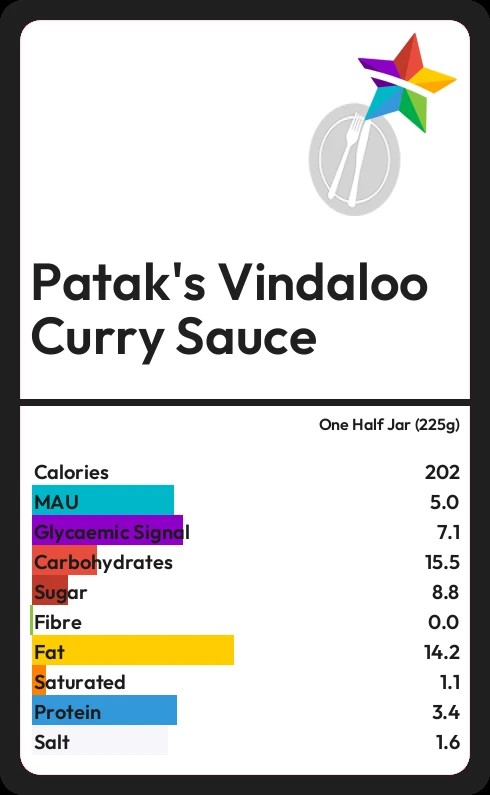 Patak's Vindaloo Curry Sauce contains 202.5 calories in one Half Jar (225g).