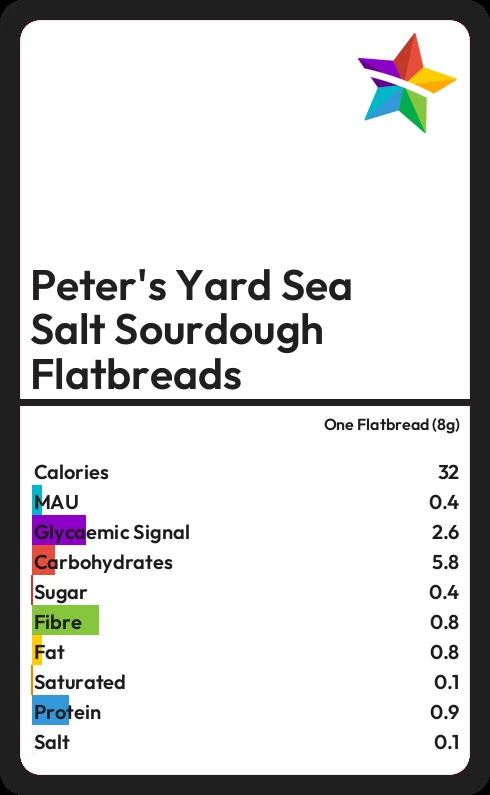 Peter's Yard Sea Salt Sourdough Flatbreads contains 0.4g sugar in one Flatbread (8g)