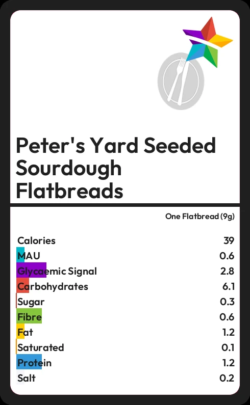 Peter's Yard Seeded Sourdough Flatbreads contains 0.3g sugar in one Flatbread (9g)