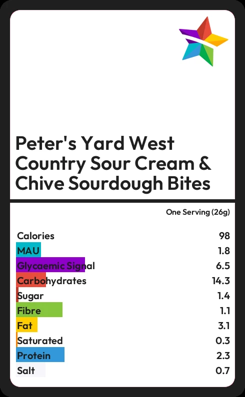 Peter's Yard West Country Sour Cream & Chive Sourdough Bites contains 1.4g sugar in one Serving (26g)