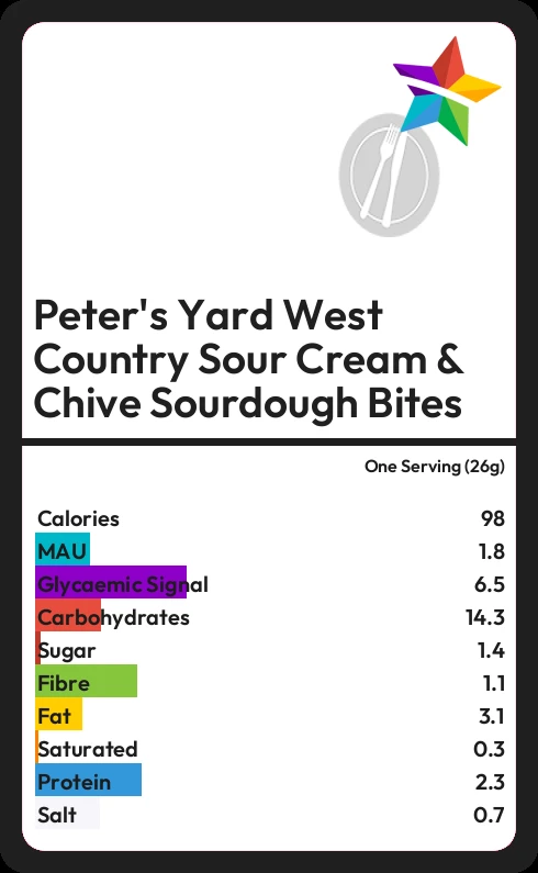 Peter's Yard West Country Sour Cream & Chive Sourdough Bites contains 1.4g sugar in one Serving (26g)
