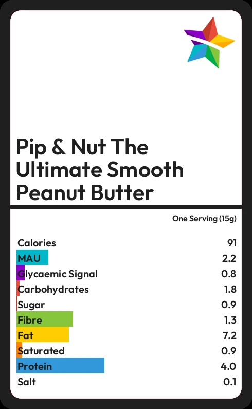 Pip & Nut The Ultimate Smooth Peanut Butter contains 0.9g sugar in one Serving (15g)