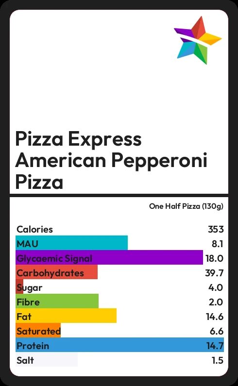 Pizza Express American Pepperoni Pizza contains 353.6 calories in one Half Pizza (130g).