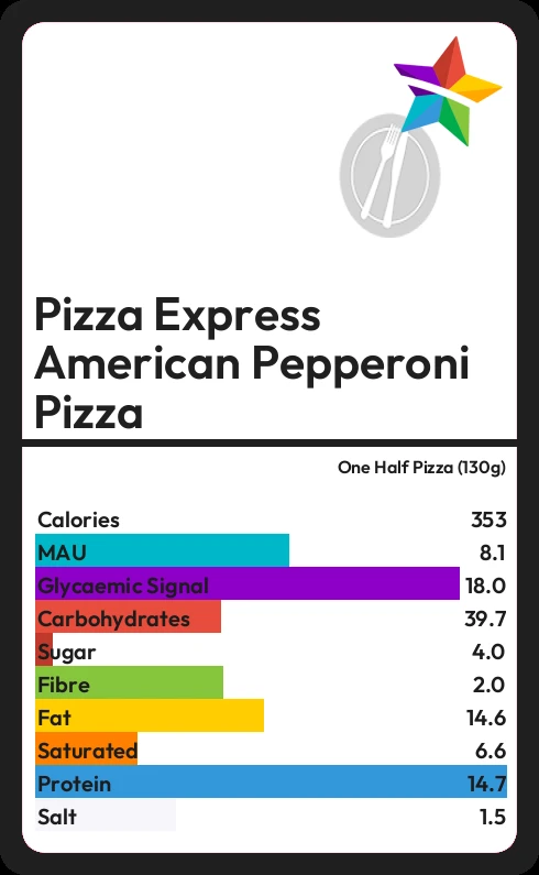 Pizza Express American Pepperoni Pizza contains 353.6 calories in one Half Pizza (130g).