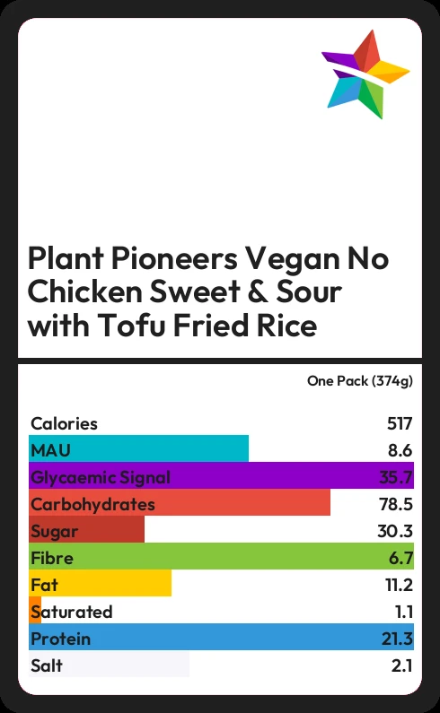 Plant Pioneers Vegan No Chicken Sweet & Sour with Tofu Fried Rice contains 30.3g sugar in one Pack (374g) - that is around 8 cubes of sugar.