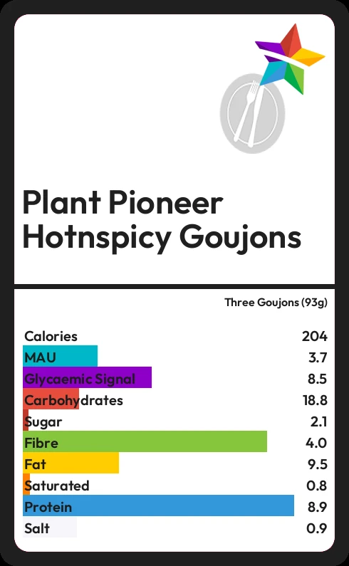 Plant Pioneer Hotnspicy Goujons contains 203.7 calories in three Goujons (93g).