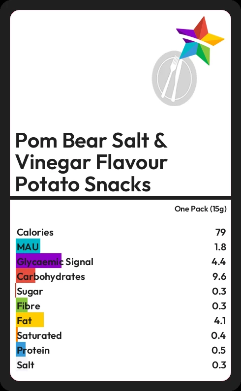 Pom Bear Salt & Vinegar Flavour Potato Snacks contains 0.3g sugar in one Pack (15g)