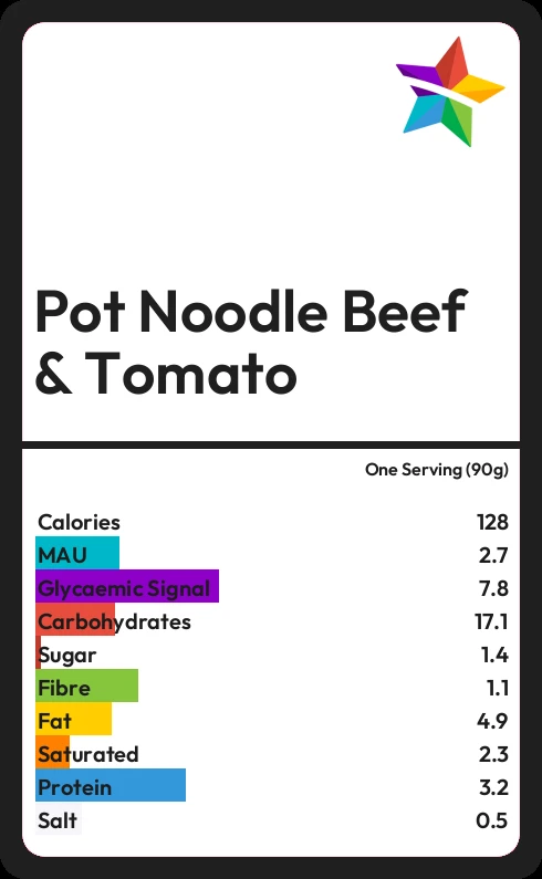 Pot Noodle Beef & Tomato contains 1.4g sugar in one Serving (90g)