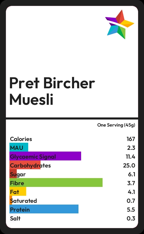 Pret Bircher Muesli contains 167 calories in one Serving (45g).