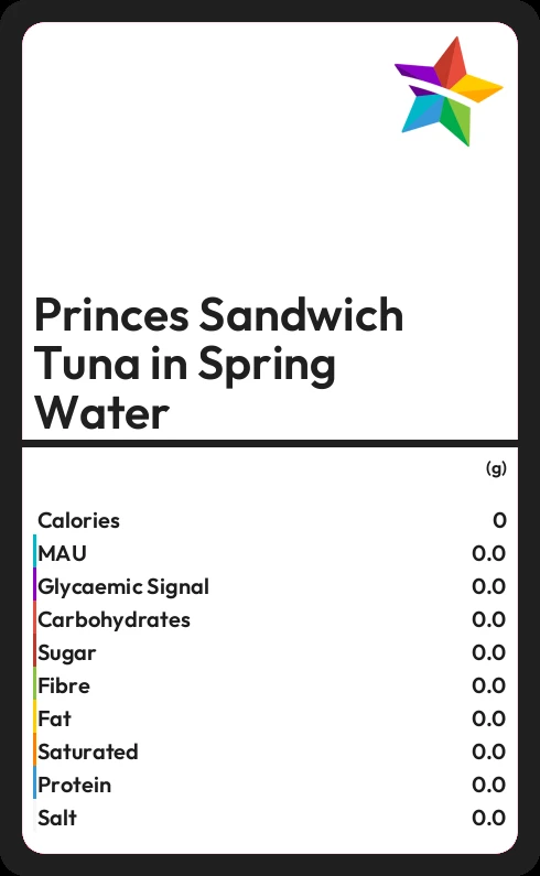 Princes Sandwich Tuna in Spring Water contains no sugar in 100g