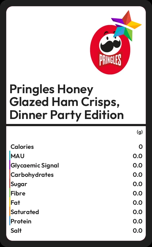 Pringles Honey Glazed Ham Crisps, Dinner Party Edition contains 4.5g sugar in 100g - that is around 1 cube of sugar.