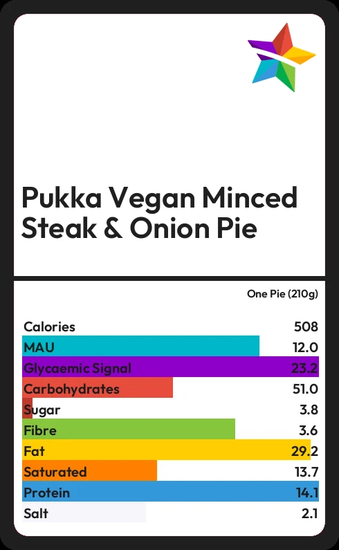 Pukka Vegan Minced Steak & Onion Pie contains 508.2 calories in one Pie (210g).