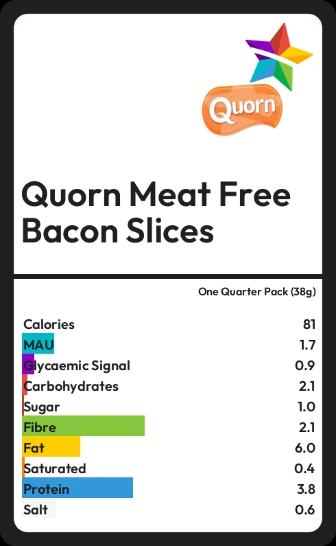 Quorn Meat Free Bacon Slices contains 80.6 calories in one Quarter Pack (38g).