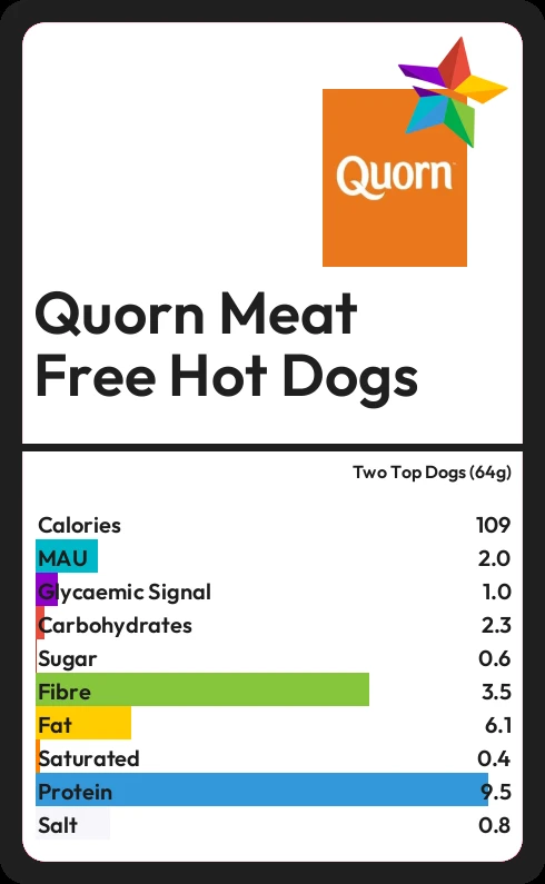 Quorn Meat Free Hot Dogs contains 0.6g sugar in two Top Dogs (64g)
