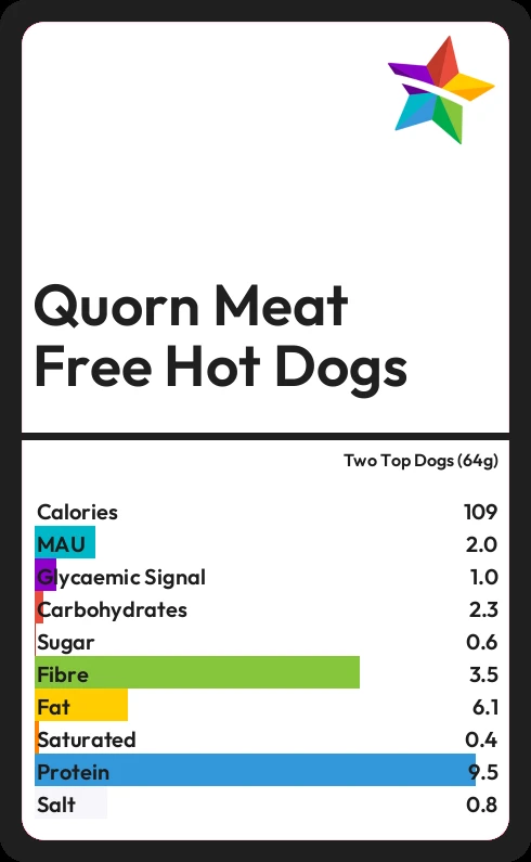 Quorn Meat Free Hot Dogs contains 0.6g sugar in two Top Dogs (64g)