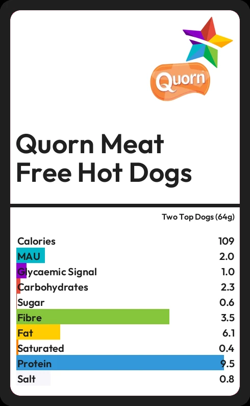 Quorn Meat Free Hot Dogs contains 0.6g sugar in two Top Dogs (64g)