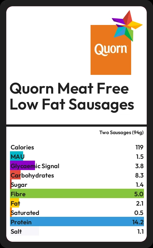 Quorn Meat Free Low Fat Sausages contains 1.4g sugar in two Sausages (94g)