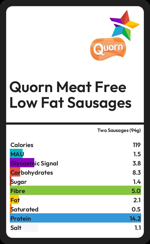 Quorn Meat Free Low Fat Sausages contains 1.4g sugar in two Sausages (94g)