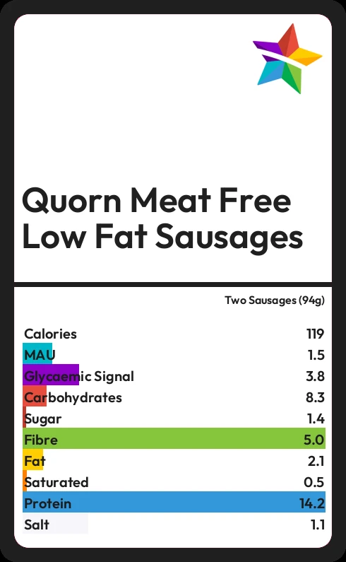 Quorn Meat Free Low Fat Sausages contains 1.4g sugar in two Sausages (94g)