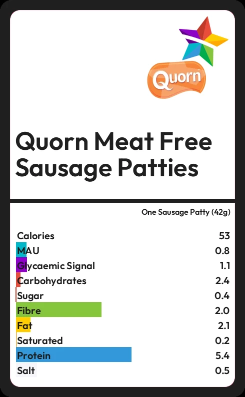 Quorn Meat Free Sausage Patties contains 0.4g sugar in one Sausage Patty (42g)