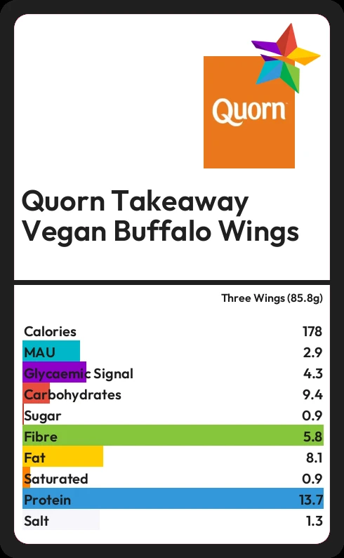 Quorn Takeaway Vegan Buffalo Wings contains 178.5 calories in three Wings (85.8g).