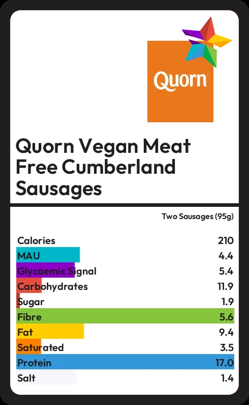 Quorn Vegan Meat Free Cumberland Sausages contains 1.9g sugar in two Sausages (95g)