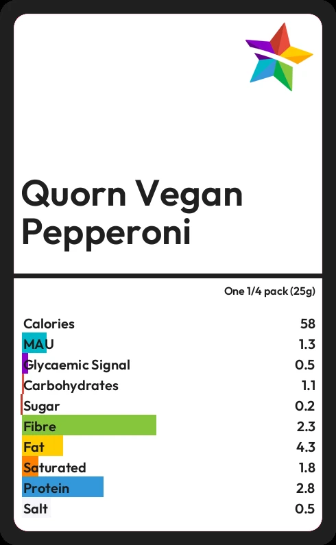 Quorn Vegan Pepperoni contains 0.2g sugar in one 1/4 pack (25g)