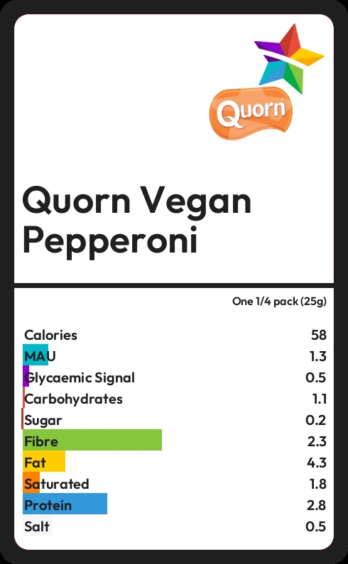 Quorn Vegan Pepperoni contains 0.2g sugar in one 1/4 pack (25g)