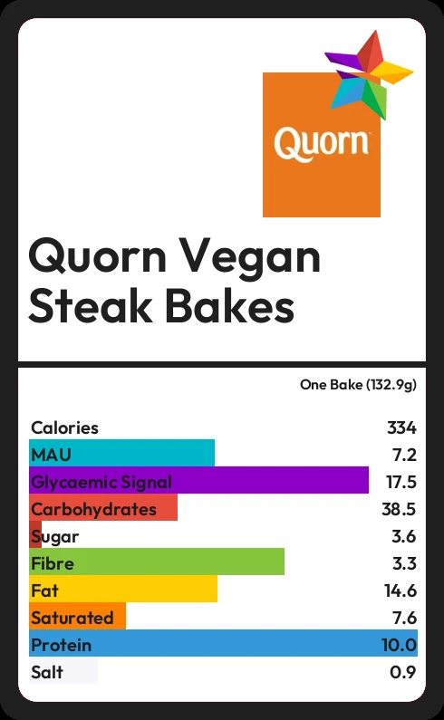 Quorn Vegan Steak Bakes contains 3.6g sugar in one Bake (132.9g) - that is around 1 cube of sugar.