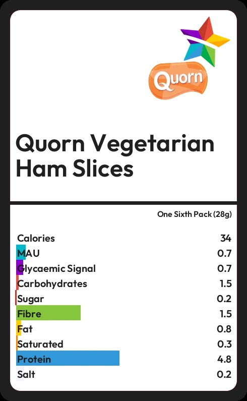 Quorn Vegetarian Ham Slices contains 34.4 calories in one Sixth Pack (28g).