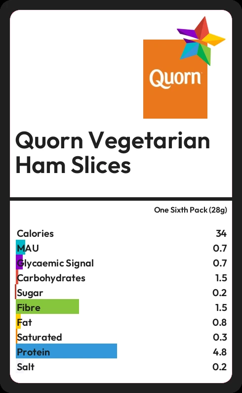 Quorn Vegetarian Ham Slices contains 34.4 calories in one Sixth Pack (28g).