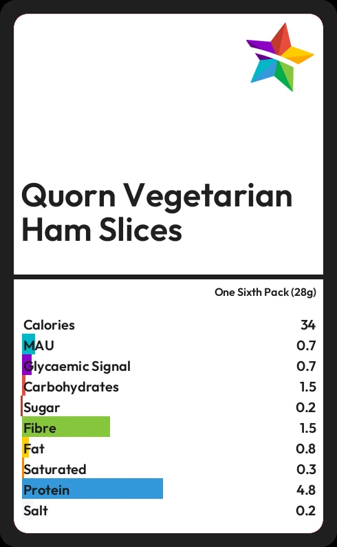 Quorn Vegetarian Ham Slices contains 34.4 calories in one Sixth Pack (28g).
