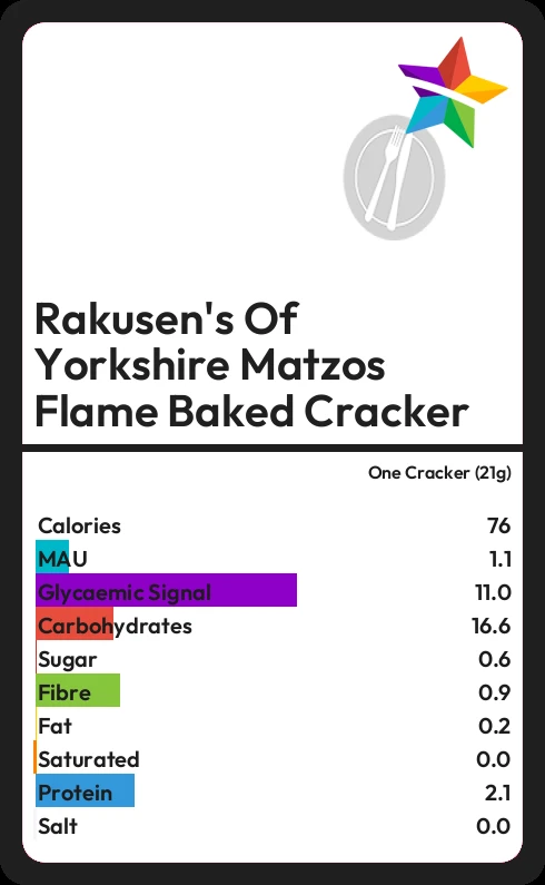 Rakusen's Of Yorkshire Matzos Flame Baked Cracker contains 0.6g sugar in one Cracker (21g)