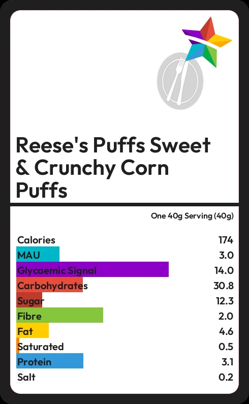 Reese's Puffs Sweet & Crunchy Corn Puffs contains 174.4 calories in one 40g Serving (40g).