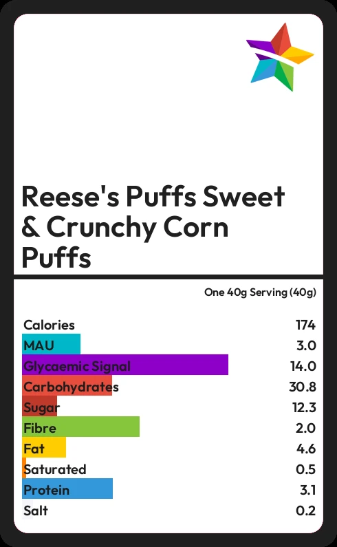 Reese's Puffs Sweet & Crunchy Corn Puffs contains 174.4 calories in one 40g Serving (40g).