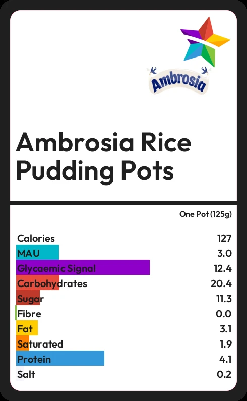 Ambrosia Rice Pudding Pots contains 127.5 calories in one Pot (125g).