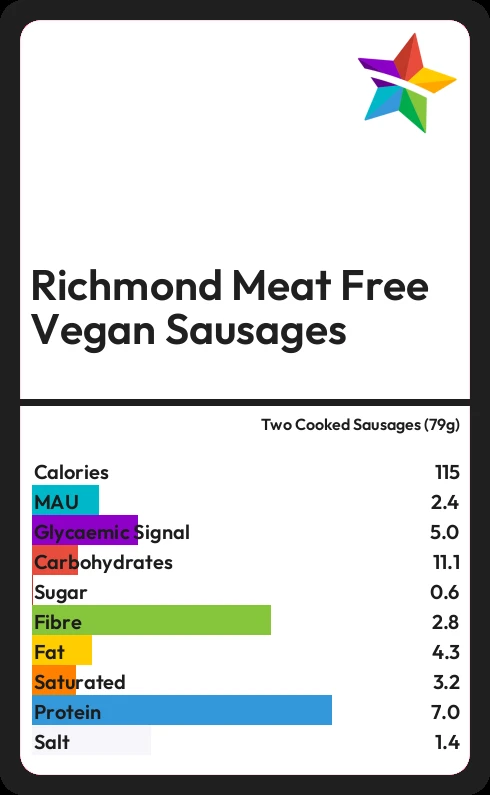 Richmond Meat Free Vegan Sausages contains 0.6g sugar in two Cooked Sausages (79g)